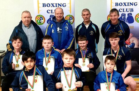 Knockmore/Foxford Boxing Club entered seven boxers into the Mayo championship recently and were successful in obtaining the full tally of titles. Front row L to R: Joshua Garvin, Martin Lawerance and Alan McTigue, Middle row; Cian Hannigan, Kaiden Hardy, Lorcan Ryder and Thomas Tuffy. Back row: club coaches Billy Rice, Tom Tuffy, Brendan Walsh and Michael McTigue. The club are intending to stage a huge weekend of boxing on March 16 and 17, in Knockmore Community Hall.