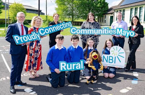 St Peter and Paul National School in Straide has received a quick cash injection of €1000 to invest in new technology thanks to the RISE Community Fund supported by National Broadband Ireland (NBI). At the announcement were, standing from left: Joe Lavin (Chief Commercial Officer, NBI), Breege Staunton (teacher), Sandra Dinan (Senior PR and Stakeholder Engagement Manager, NBI), school principal, Caithriona Murrihy, David Mulligan (ATU Sligo) and Tara Collins (Chief Marketing Officer, NBI). Front, from left: Alex Moloney, Killian Tighe, Sophia Moloney and Chloe Hughes. Picture by Dillon Photography
