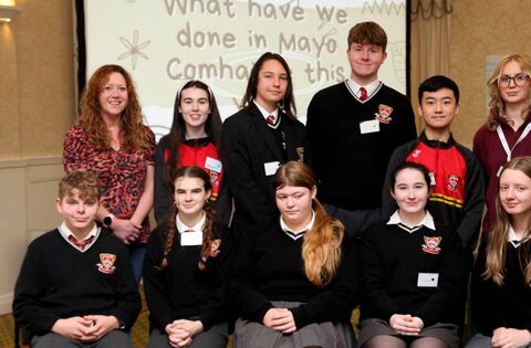 Pictured at the Mayo Comhairle na nÓg Youth Conference were students from Moyne College, Ballina, with teacher Jackie Langan. Picture: Trish Forde
