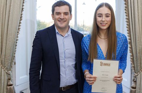 Ballinrobe Community School past pupil Ailbhe O'Loughlin was presented with The Fidelis Partnership scholarship at an event held in University of Limerick recently by Robert Kelly, CEO of Fidelis. Ailbhe is currently studying International Business at University of Limerick. Pic Arthur Ellis