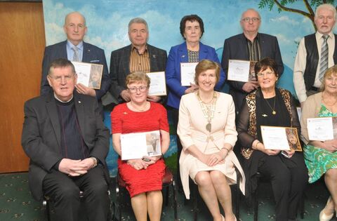 Pictured at the Mid-Killala Pioneers Annual Dinner and Dance in Hiney’s Upper Deck with their long service awards are back row from left; Michael Mulhern, Glenhest (Gold Pin), Kevin Joe Marley Glenhest (Gold Pin), Mary Granaghan, Keenagh (Diamond Award), Joe Caine Glenhest (Gold Pin) and PC Judge, Kilurry (Gold Pin). Seated from left Fr Pat Munnelly Mid-Killala Spiritual Director, Kathleen Monaghan, Cill Chomain (Diamond Award), Francis Egan (Galway National President of The Pioneers Association), Maureen Gallagher, Ardagh (Gold Pin), and Una Judge, Kilmurry (Gold Pin).