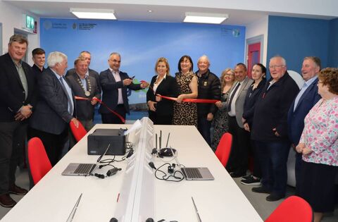 Minister of State at the Department of Enterprise, Trade and Employment, Dara Calleary, cutting the tape to officially open the all new Gteic facility at Teach Greannaí in Cornboy recently.