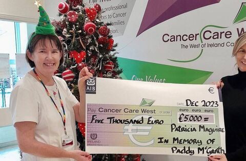 Patricia Maguire, Rehins, Ballina, making a presentation of €5,000 to Cancer Care West nurse Catherine McCormack. Patricia raised the funds in memory of her beloved father Paddy McGrath from Rossport. Patricia extends thanks to everyone who generously supported this very worthy cause.