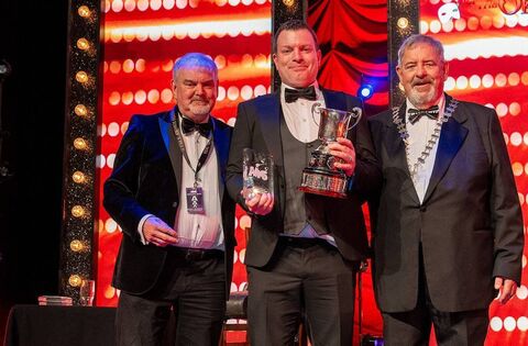 Kenneth McCarthy of Ballinrobe Musical Society pictured (centre) with the Best Stage Management (Gilbert) award at the 2024 AIMS Awards in the INEC in Killarney. Pictured also are (left) AIMS Vice-President Gerry Sweeney and (right) AIMS President Feargal Kavanagh. Pic: Darragh Carroll Photography