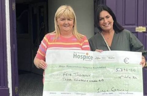 Martina Jennings, Mayo Roscommon Hospice receiving a cheque from Linda Conway for €5,390 which was the proceeds from the Sunflower Day held in June in Belmullet.