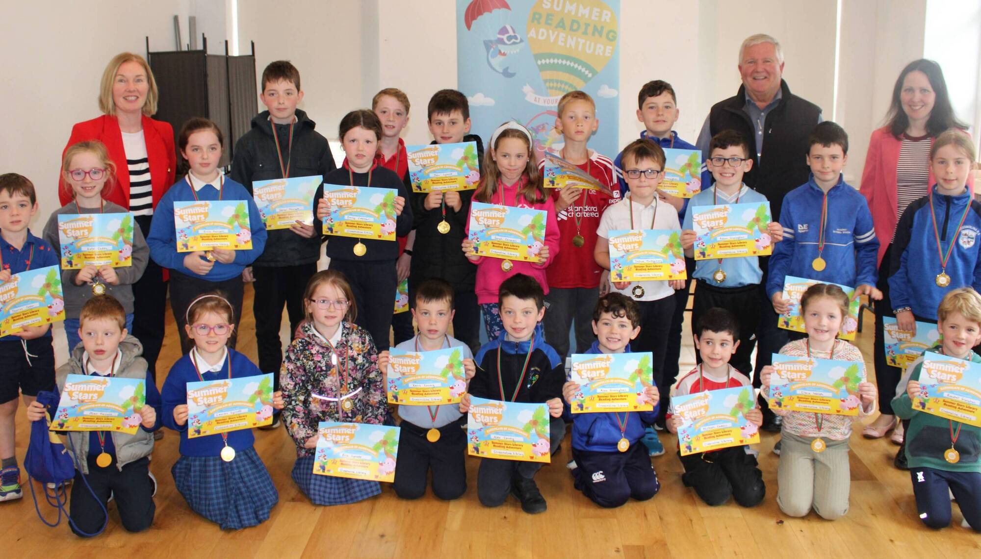 Children from the Crossmolina area who took part in the summer reading in the Crossmolina Library pictured with Olivia Donohoe (Librarian), Cllr Michael Loftus and Aishling Bourke (Librarian).