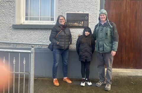 Descendants of Limerick man Professor William O'Shaughnessy were in Foxford last week to view the plaque on the former Music School that commemorates the pageant which was staged in 1942 to mark the golden jubilee of the local Woollen Mills. Professor O'Shaughnessy composed the music for the elaborate production.