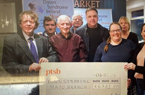 Pictured in the Moy Hotel, Foxford, at the presentation of the proceeds from the recent Coolegrane Christmas Lights Foxford appeal in aid of Down Syndrome Ireland Mayo Branch are Kevin Hughes, (left), Coolgrane Christmas Lights, presenting a €6,755 cheque to Deirdre O’Malley, (right), Down Syndrome Mayo. Also included back, from left: Brendan Hughes, (Coolgrane Christmas Lights); Pat Boyle, Stephen Barrett, William Noone, Paula Murphy and Kathrina Barrett.