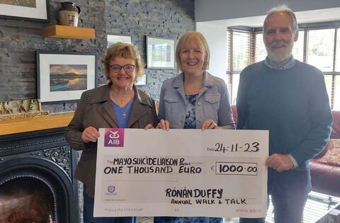 Una and Gerry Duffy presenting a cheque for €1000 to Máire Ní Dhomhnall (centre) Director of the Family Life Centre, Castlebar, following a "Walk and Talk " event in memory of their son Ronán. In total they collected €3500 with the remaining €2500 presented to the Patient Comfort Find, St John's, Sligo.