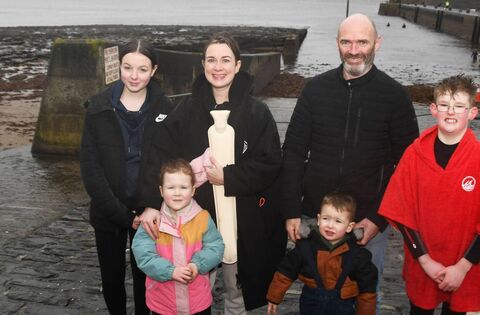 Enjoying the New Year's Day Swim at Enniscrone Pier were Kenneth, Elaine, Marion, Kenneth and Kieran Mulvaney from Cork. Picture: John O'Grady