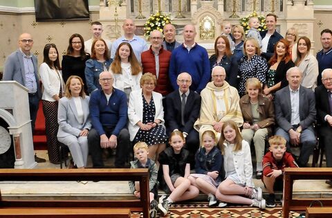 Foxford parish priest Fr Padraig Costello is pictured with members of his family at a special Mass in St Michael's Church in Foxford to celebrate the golden jubilee of his ordination to the priesthood. There was a huge turnout for the Mass and reception in the local Sports and Leisure Centre with many tributes paid to Fr Padraig, who has served in eight parishes in the Diocese of Achonry over the past 50 years.